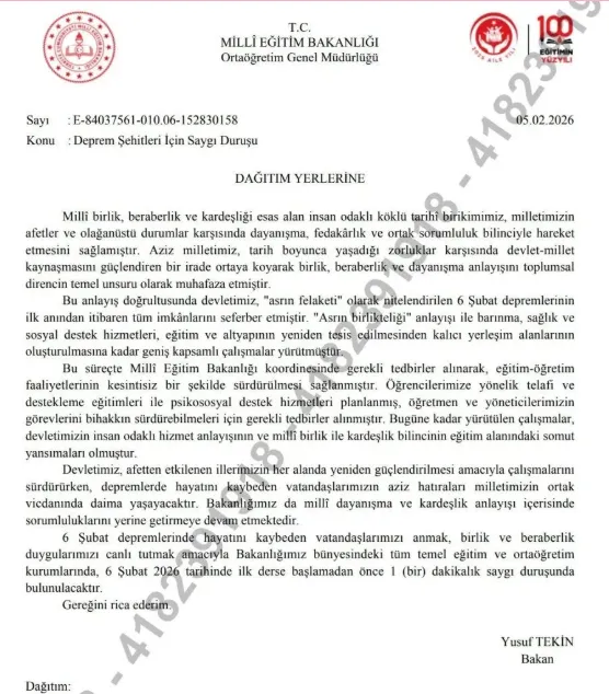 Millî Eğitim Bakanlığı (MEB), 6 Şubat Kahramanmaraş merkezli depremlerin yıl dönümü vesilesiyle, ülke genelindeki her bir eğitim kurumunda derin bir saygı ve anma iklimi oluşturma kararı aldı. Bakan Yusuf Tekin’in imzasıyla tüm valiliklere ve okul yönetimlerine ulaştırılan resmi talimatla birlikte, yarın sabah sınıflara girilmeden önce depremde hayatını kaybeden vatandaşlarımızın aziz hatıraları yad edilecek.
