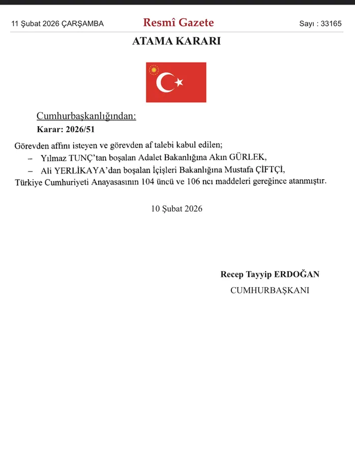 11 Şubat 2026 tarihli resmi Gazete’de yayınlanan kararlar içişleri Bakanı Ali Yerlikaya görevden alındı. Görevden alınan bir diğer bakan ise adalet Bakanı Yılmaz Tunç oldu