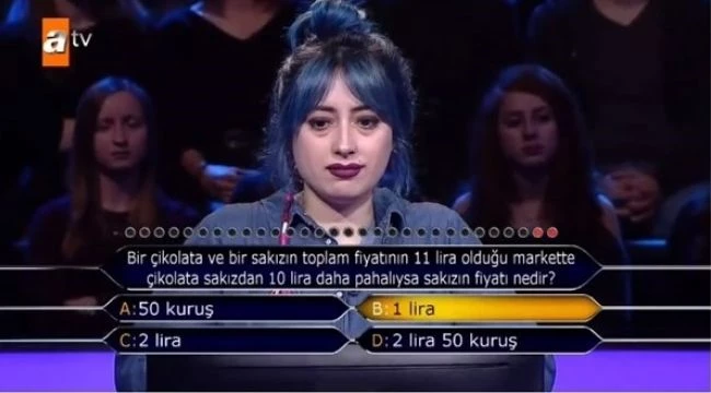 Atv'de yayınlanan Kim Milyoner Olmak İster adlı yarışma programının Pazartesi akşamı ekrana gelen yeni bölümünde çıkan ilginç matematik sorusu yarışmacıyı yanılttı. Kim Milyoner Olmak İster'de çıkan 'Bir çikolata ve bir sakızın toplam fiyatının 11 lira olduğu markette çikolata sakızdan 10 lira daha pahalıysa sakızın fiyatı nedir?' sorusunun doğru yanıtı ne çıktı?