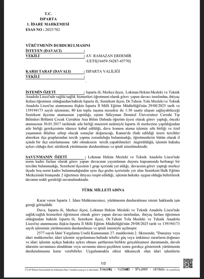 Isparta 1. İdare Mahkemesi (Esas No: 2025/702), yürütmenin durdurulması talebini 2577 sayılı İdari Yargılama Usulü Kanunu'nun 27. maddesi ışığında inceledi.