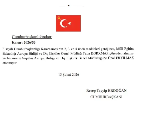 Eğitim dünyasının dış dünyaya açılan penceresi niteliğindeki Avrupa Birliği ve Dış İlişkiler Genel Müdürlüğü’nde ise sürpriz bir bayrak değişimi yaşandı. 2026/53 sayılı karar uyarınca, bu görevi yürüten Tuba Korkmaz görevinden alındı. Korkmaz’dan boşalan bu stratejik koltuğa ise Ünal Eryılmaz atandı.