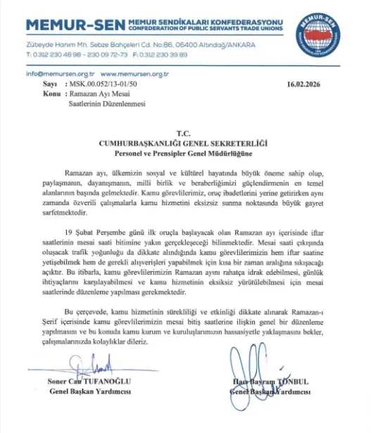 Memur-Sen Genel Başkan Yardımcıları Soner Can Tufanoğlu ve Hacı Bayram Tonbul’un imzalarını taşıyan başvuru, T.C. Cumhurbaşkanlığı İdari İşler Başkanlığına sunuldu. Kamu görevlilerinin çalışma koşullarını iyileştirmeyi hedefleyen bu yazıda, mevcut mesai saatlerinin Ramazan ayının manevi iklimi ve pratik zorlukları göz önünde bulundurularak yeniden planlanması gerektiği vurgulandı.