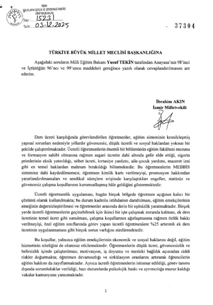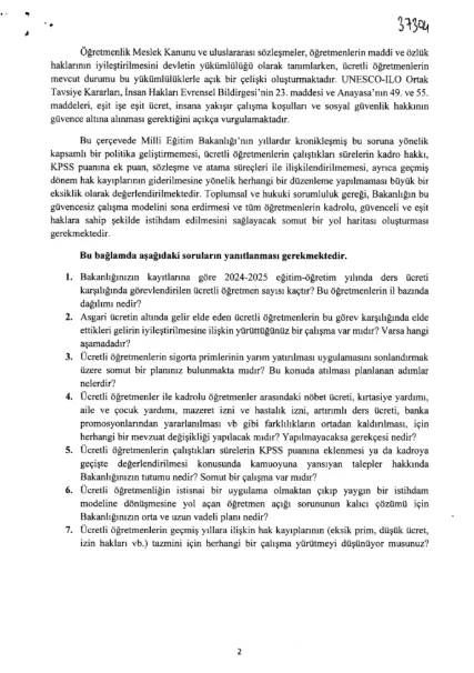 Teklifin sunulmasının ardından, Milli Eğitim Bakanı Yusuf Tekin'den yazılı olarak yanıtlanması talep edildi. Milletvekilinin önergesinde, ücretli öğretmenlik sisteminin istisnai bir durum olmaktan çıkıp, neredeyse kalıcı bir istihdam modeline dönüştüğüne dikkat çekildi. Bu durumun, öğretmenlerin mesleki itibarını zedelediği, özlük haklarından mahrum bıraktığı ve gelecek kaygısı yarattığı vurgulandı. Teklif, bu insan odaklı soruna somut ve kalıcı bir çözüm getirmeyi amaçlıyor.